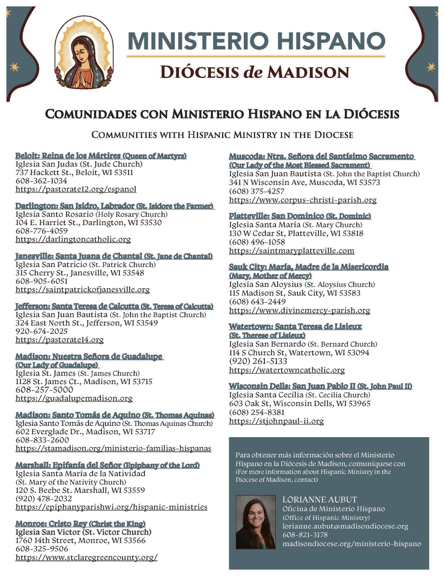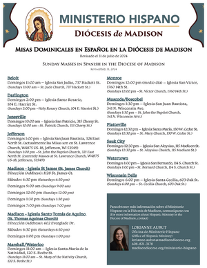 Por favor vea los siguientes folletos para obtener información sobre las Misas Dominicales en español y las parroquias con Ministerio Hispano en la Diócesis de Madison.