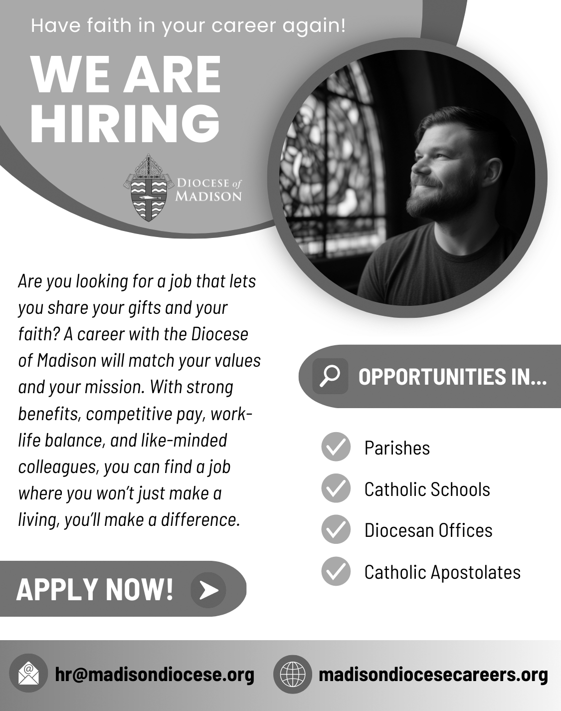 Parishes are most welcome to include notes about job openings within the diocese (the diocesan offices, parishes, and schools) in their bulletins and parish emails. See the bulletin graphics and PDF flyers below.