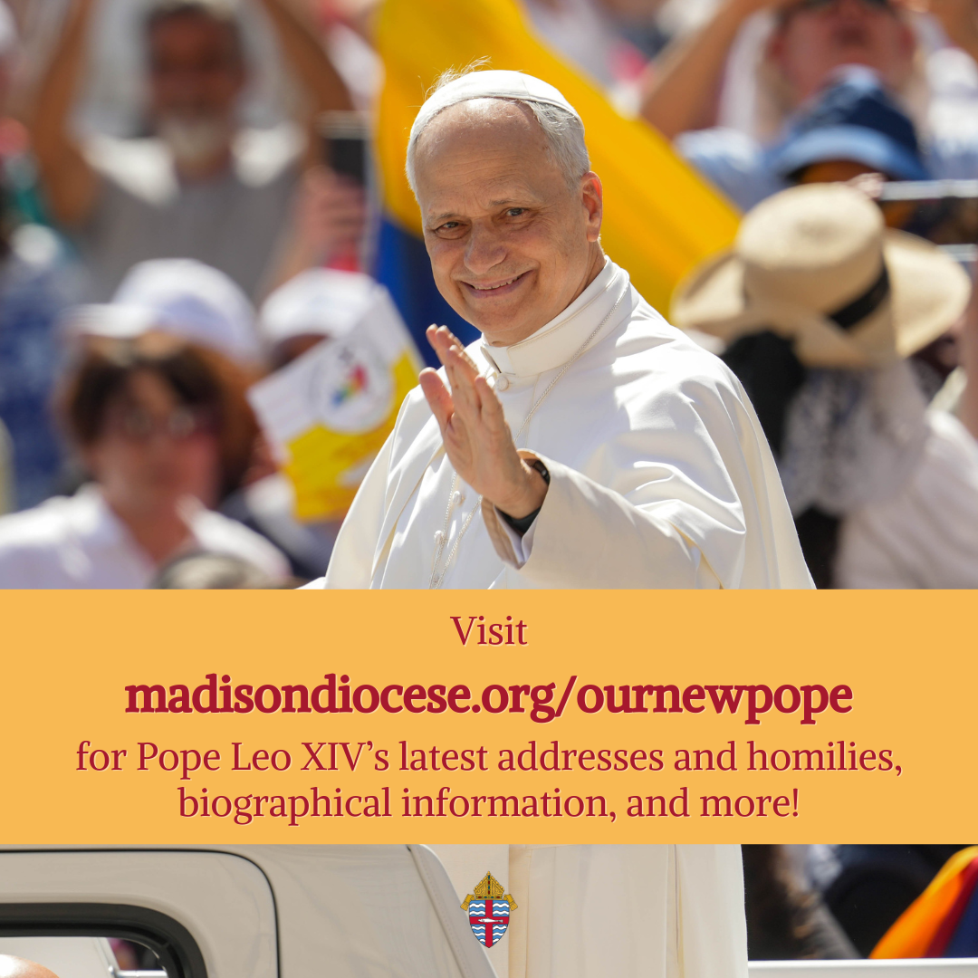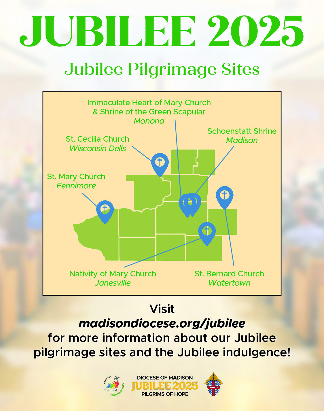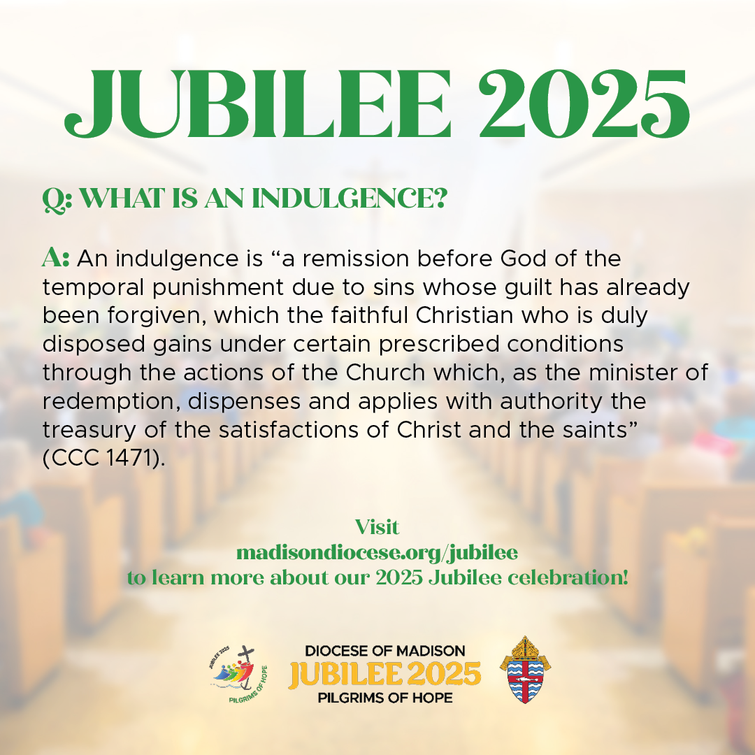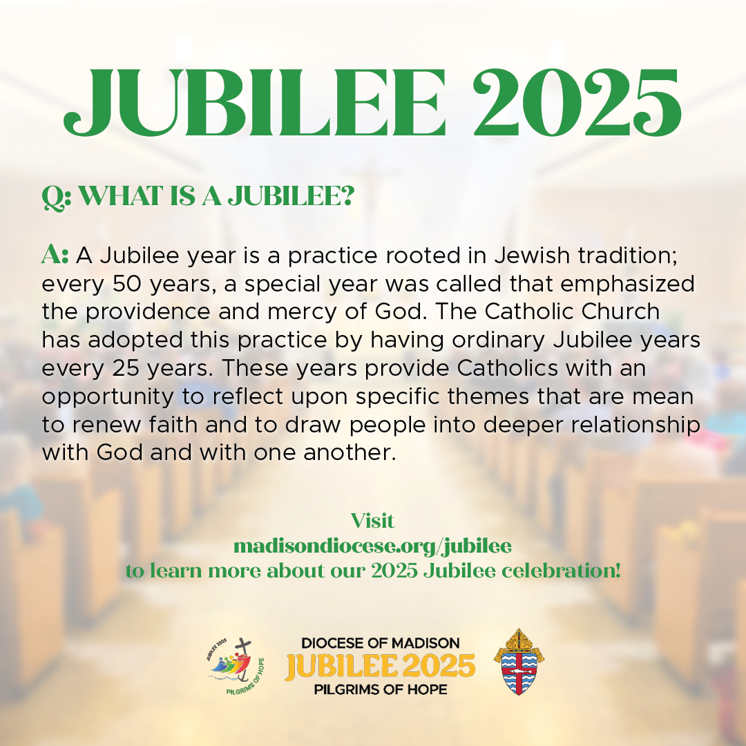 The Diocese of Madison is offering special events and opportunities for the faithful to spiritually participate in the 2025 Jubilee, Pilgrims of Hope. Please share our Jubilee webpage (madisondiocese.org/jubilee in English, and madisondiocese.org/jubileo in Spanish) in your bulletins and other communications channels, and check the parish resource page regularly for promotion materials related to specific events in the Diocese of Madison.