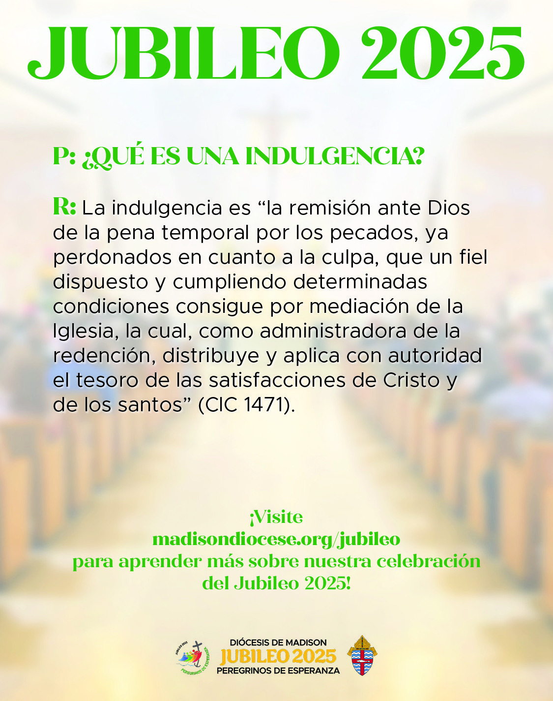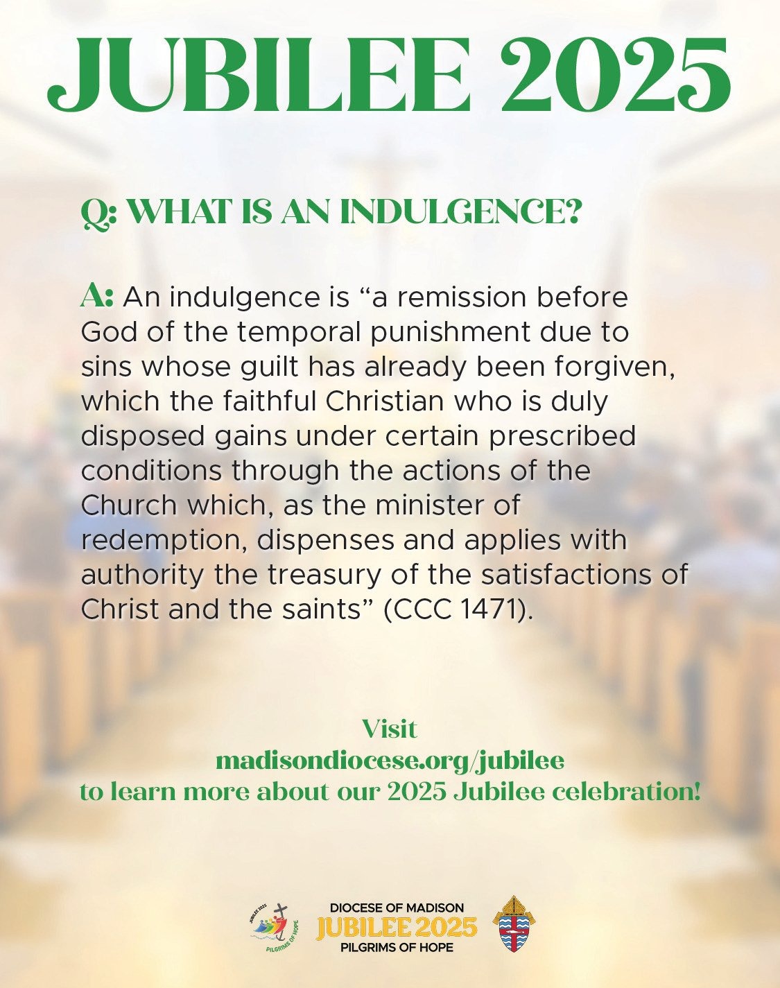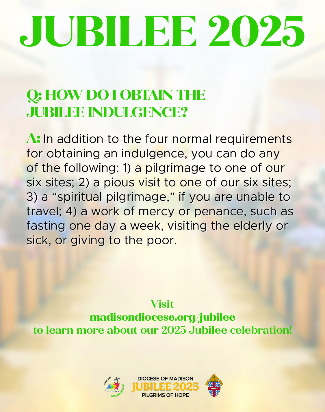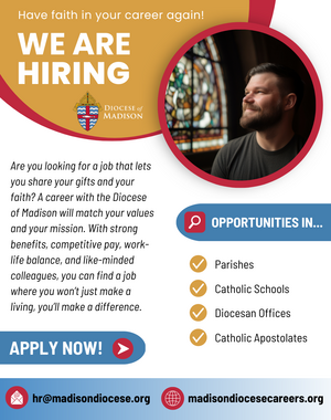 The Diocese of Madison is offering special events and opportunities for the faithful to spiritually participate in the 2025 Jubilee, Pilgrims of Hope. Please share our Jubilee webpage (madisondiocese.org/jubilee in English, and madisondiocese.org/jubileo in Spanish) in your bulletins and other communications channels, and check the parish resource page regularly for promotion materials related to specific events in the Diocese of Madison.